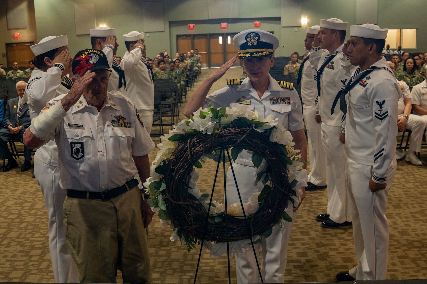 Across from a building recently named after Kilmer, Navy Medicine Training Support Center (NMTSC) hosted a ceremony honoring the 70th anniversary of Kilmer's actions, in which hospital corpsmen and students attending the Hospital Corpsman Basic Course honored his sacrifice by conducting a wreath-laying ceremony, playing of taps and conducted the final roll call which honors a fallen service member.