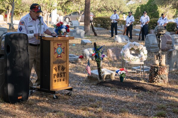 220813-N-IT566-0039 SAN ANTONIO, Texas (Aug. 13, 2022) Joseph Barna, a Marine that served with Hospitalman John E. Kilmer in Korea, explains how Kilmer saved his life during a graveside ceremony commemorating the 70th anniversary of his death. Barna also shared other stories of their time together in Korea. Kilmer was killed, during the attack on “Bunker Hill”, while using his body to shield another man from enemy fire. On June 18, 1953, Kilmer’s mother and brother were presented the Medal of Honor for his actions on Aug. 12, 1952. (US Navy Photo by Mass Communications Specialist 1st Class David Kolmel/Released)