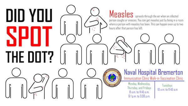 “Measles is an airborne, extremely infectious, and potentially severe viral illness. It is spread when an infected person breathes, coughs or sneezes to release viruses in the air. Measles can cause a mild febrile illness with a rash or lead to hospitalization (one in five), pneumonia (one in 20), brain infection and possibly death,” said Capt. Jackie McDowell, NHB preventive and occupational medicine physician.