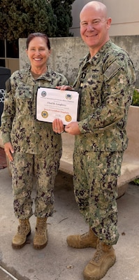 Naval Medical Center San Diego (NMCSD) Director, U.S. Navy Capt. Elizabeth Adriano, presented U.S. Navy Lt. Cmdr. Chad Laughrey, chaplain at NMCSD, with his board certification from the National Association of Veterans Affairs Chaplains at NMCSD, Feb. 17.