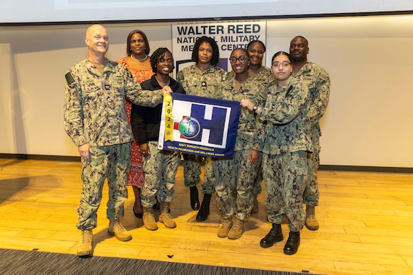 Members of Walter Reed/Navy Medicine Readiness and Training Command (NMRTC) Health Promotion and Wellness Committee show off the U.S. Navy Surgeon General's Blue H flag and ribbon Gold Star awarded by the U.S. Navy SG for health promotion and wellness programs and activities held at Walter Reed during 2024 promoting responsible drinking, healthy eating, active living, psychological wellness, sexual heath, tobacco-free living and weight management.