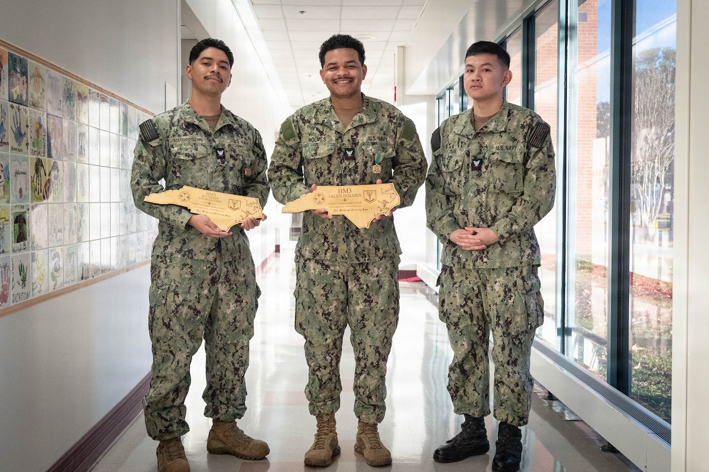 The staff of Naval Health Clinic Cherry Point gathered Monday, November 24 to celebrate the promotion of one Corpsman and honor the excellence in patient care of two others. Hospital Corpsman Third Class An Tran, right, promoted to the rank. Tran serves in the clinic’s Preventive Medicine Department. Hospital Corpsman Third Class Jalen Holmes, center, was awarded the Navy and Marine Corps Achievement Medal for his service in the clinic’s Patient Centered Medical Home from November 2023 to December 2025. Hospital Corpsman Third Class Anthony Soloriosolorio, left, was awarded the Navy and Marine Corps Acheivement Medal for his service in the clinic’s Patient Centered Medical Home from October 2023 to November 2025. Soloriosolorio was also awarded the Military Outstanding Volunteer Service Medal for contributing 223 volunteer hours to various organizations like the Armed Services Blood Program, Seashore Soccer League and MCAS Cherry Point Food Drive.