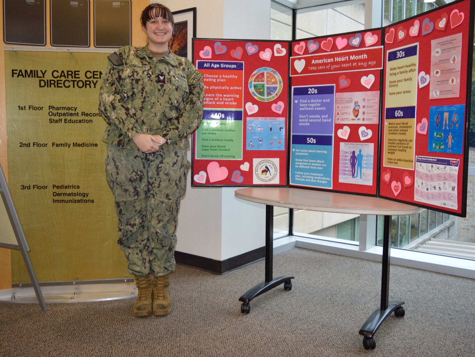 Take heart… Machinist’s Mate, Nuclear Power 2nd Class Grace McCracken, assigned to Naval Hospital Bremerton’s Health Promotion and Wellness department, crafted several static displays, informative presentations and knowledge-based exhibitions throughout Naval Hospital Bremerton acknowledging February as Heart Health Month. Her work highlighted the need for multiple age groups – from those in their 20s up to those in their 60s - to beware of specific needs and warning signs, as well as another which focused on how multicolored foods are visual reminders of a wide range of nutrients (Official Navy photo by Douglas H Stutz, NHB/NMRTC Bremerton public affairs officer).