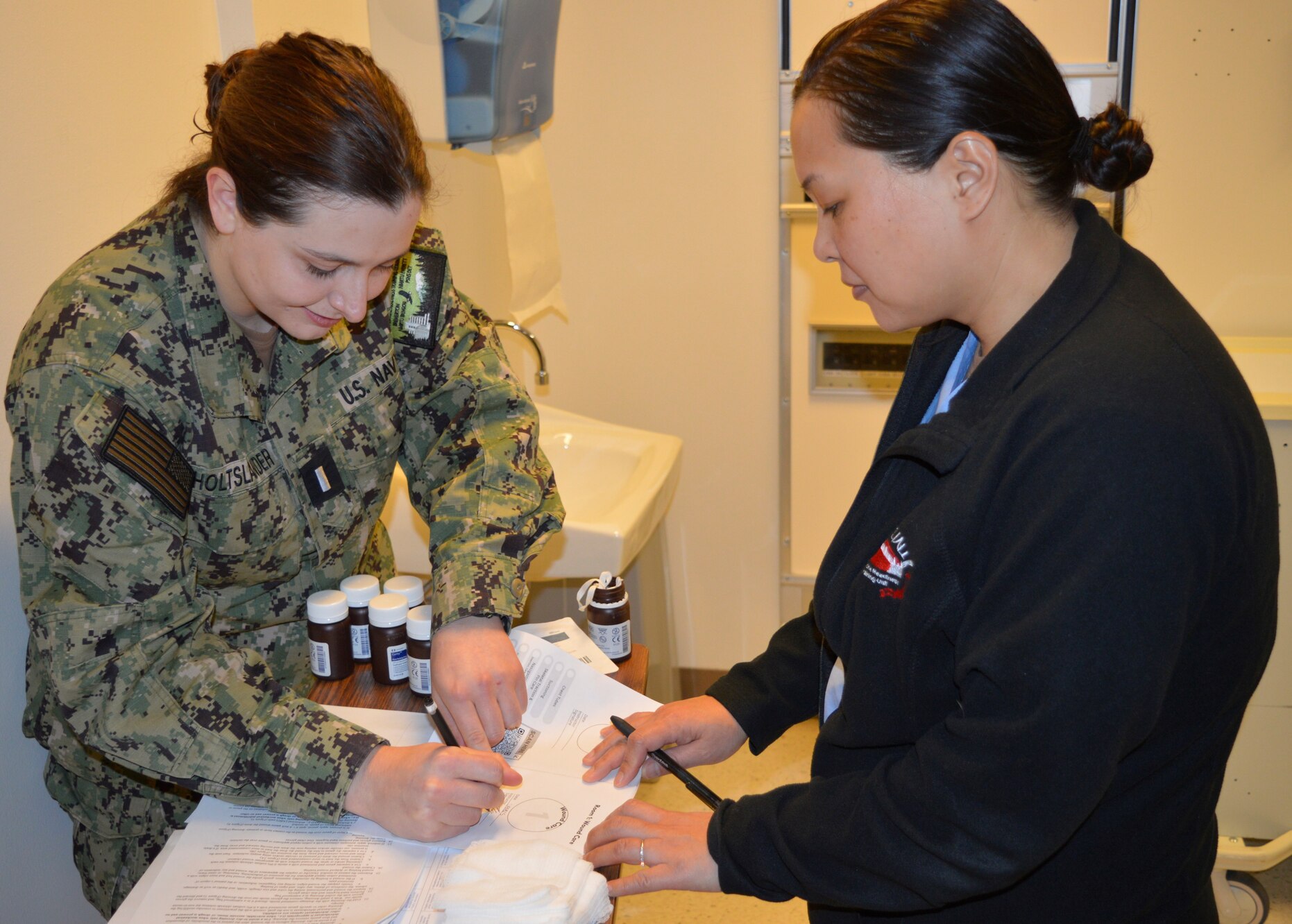 A sustainment sign of the training times…Lt. j.g. Meryn Holtslander gives the passport stamp of completion after imparting instruction in Naval Hospital Bremerton’s Skill Fair Wound Care module, which featured such instruction as burn wound care, wound cleaning and irrigation of traumatic wound(s), and dealing with pressure injuries. The skills fair provided five clinical sustainment training modules – also including an Airway module which went over oxygen therapy with nasal cannula and oxygen mask, cervical collar management and electrocardiogram use; a Lines and Specimen Collection module discussed such needs as urinary catheter use, blood product administration and intravenous therapy; Postmortem Care module covered grief support, operational stress control and peer debriefing and a What’s Wrong with the Room module encompassing medication administration, errors with the patient and errors with the inpatient room setting. Each participant was provided a passport, designed as a guide for each of the training modules. Upon completion of each instructional session, their passport would be stamped as having completed that module. The clinical sustainment is vital for mission readiness and is in keeping with the Navy surgeon general’s priority of being a ready medical force able to support a medically ready force (Official Navy photo by Douglas H Stutz, NHB/NMRTC Bremerton public affairs officer).