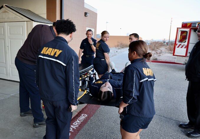 Hospital corpsmen assigned to the Multi-Service Unit at Naval Hospital Twentynine Palms participate in Tactical Combat Casualty Care (TCCC) training alongside the Marine Corps Air Ground Combat Center Fire Department on March 21. The hands-on exercise reinforced critical trauma response skills, ensuring corpsmen are prepared to provide life-saving care in mass casualty and combat scenarios (U.S. Navy photo by Christopher C. Jones, NHTP/NMRTC Twentynine Palms public affairs officer).