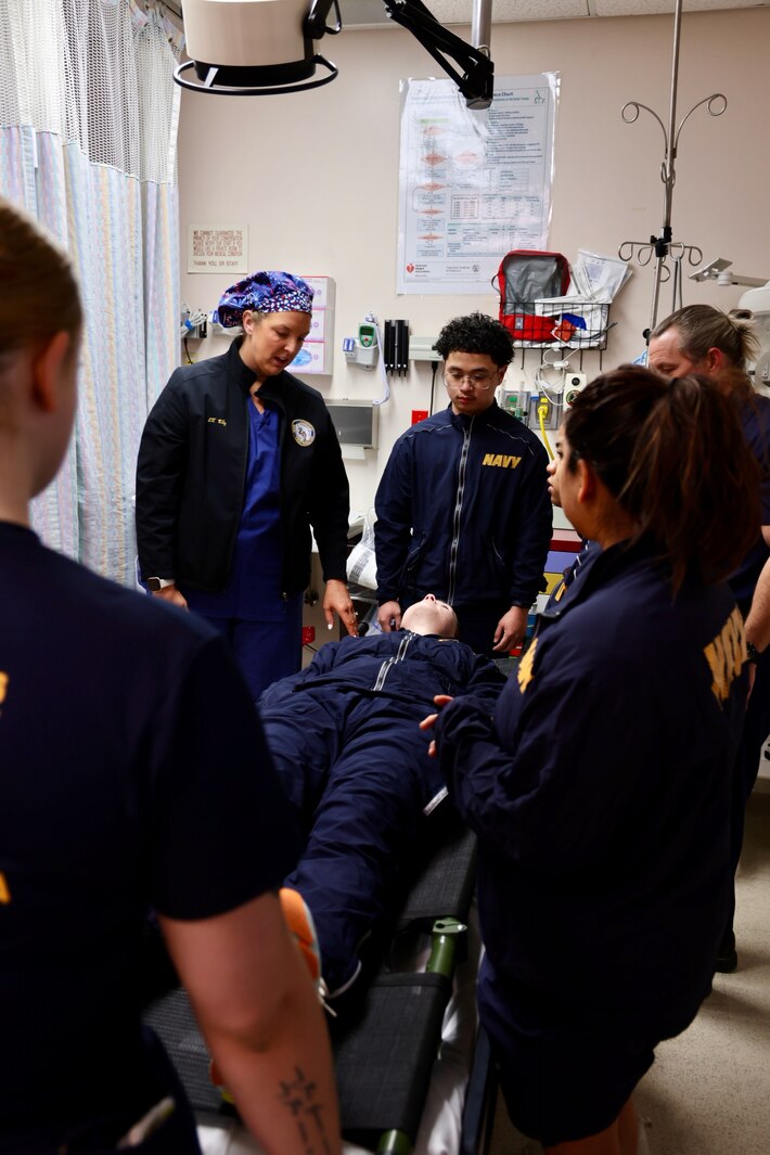 Hospital corpsmen assigned to the Multi-Service Unit at Naval Hospital Twentynine Palms participate in Tactical Combat Casualty Care (TCCC) training alongside the Marine Corps Air Ground Combat Center Fire Department on March 21. The hands-on exercise reinforced critical trauma response skills, ensuring corpsmen are prepared to provide life-saving care in mass casualty and combat scenarios (U.S. Navy photo by Christopher C. Jones, NHTP/NMRTC Twentynine Palms public affairs officer).