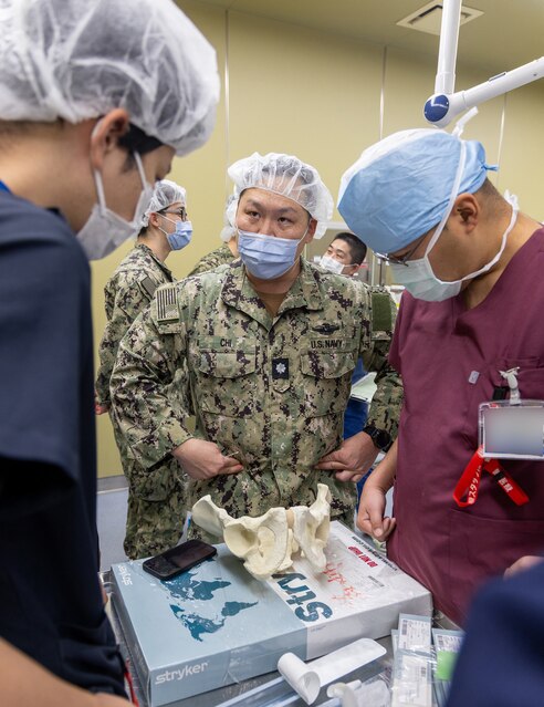 TAURA, Japan (Feb 27, 2025) Lead orthopedic surgeon, Cmdr. Benjamin Chi provided didactic and practical training on the application of external fixation pins and the physics of external fixators as well as unstable pelvic fractures during the pre-exercise team building. Japan Self-Defense Force (JSDF) Hospital Yokosuka and U. S. Navy Medicine Readiness and Training Command (NMRTC) Yokosuka personnel conduct surgical training during a joint disaster response drill. The exercise focused on enhancing hospital administrative and command staff capabilities between NMRTC Yokosuka and JSDF Hospital Yokosuka in the event of a large-scale natural disaster, such as a major earthquake. It also provided an opportunity for U.S. and Japanese medical teams to improve emergency response capabilities through collaborative triage and surgical training. (U.S. Navy photo by Ai Hazama/USNMRTC Yokosuka Public Affairs)