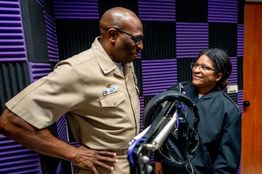 250328-N-TY711-9287 SIGONELLA, Italy (Mar. 28, 2025) Capt. TaRail A. Vernon, Commanding Officer, U.S.Naval Hospital Sigonella and Hospital Corpsman 2nd Class Shelby Sutton, Fleet Liaison assigned to U.S. Naval Hospital Sigonella, together during their recording of Capt. Vernon's Patient Informational Minute - Checking In and Out of the Hospital, Mar. 28, 2025 (U.S. Navy photo by Lieutenant Commander Brandi Gibson).