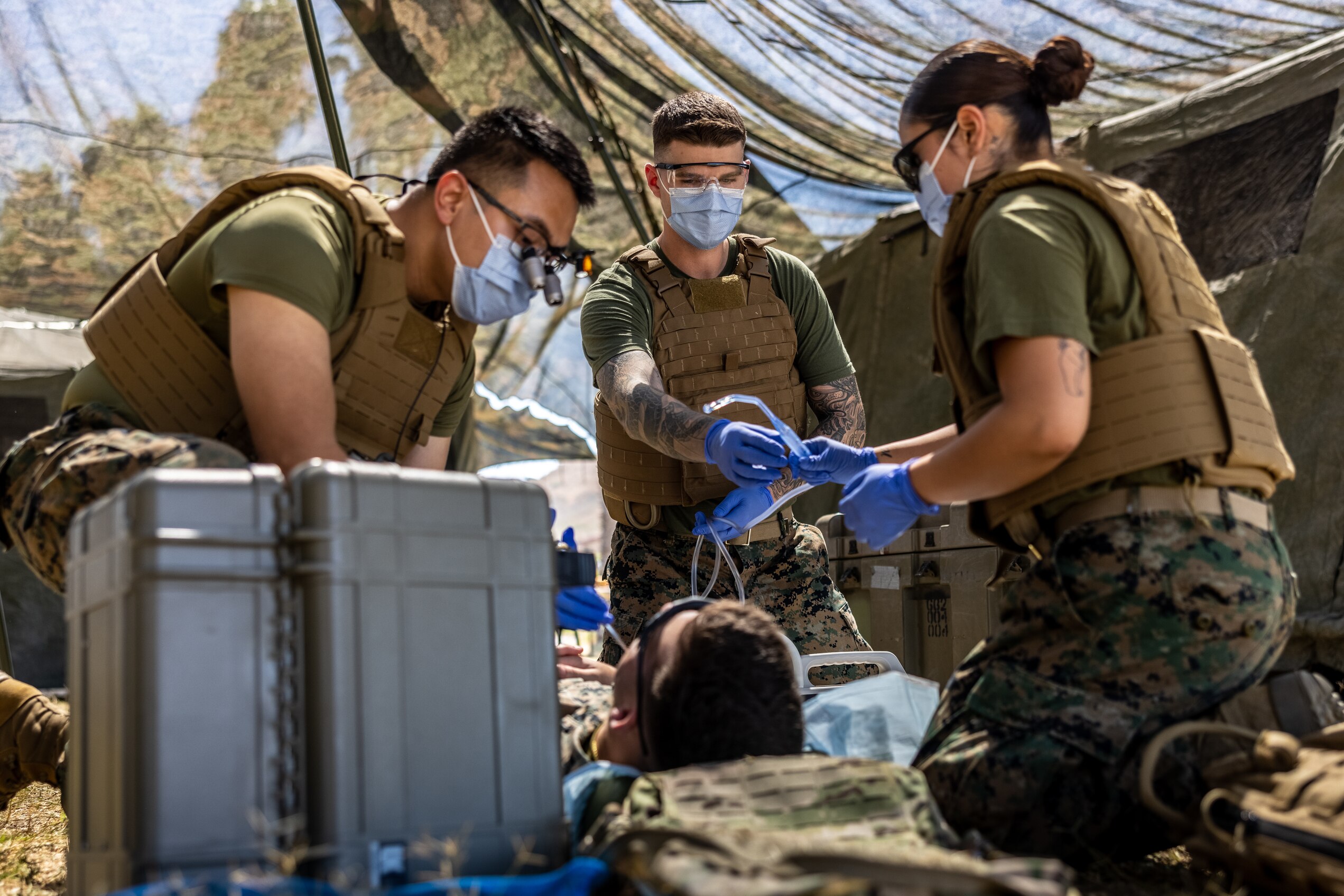 U.S. Navy Sailors with 1st Dental Battalion, 1st Marine Logistics Group, provide patient care during Authorized Dental Allowances List (ADAL) Exercise 25.1 on Marine Corps Base Camp Pendleton, California, Sept. 16, 2025. ADALEX is held semiannually to test and qualify corpsmen and dental assistants while building proficiency with expeditionary equipment and field operations in preparation for deployment. (U.S. Marine Corps photo by Lance Cpl. Mhecaela J. Watts)