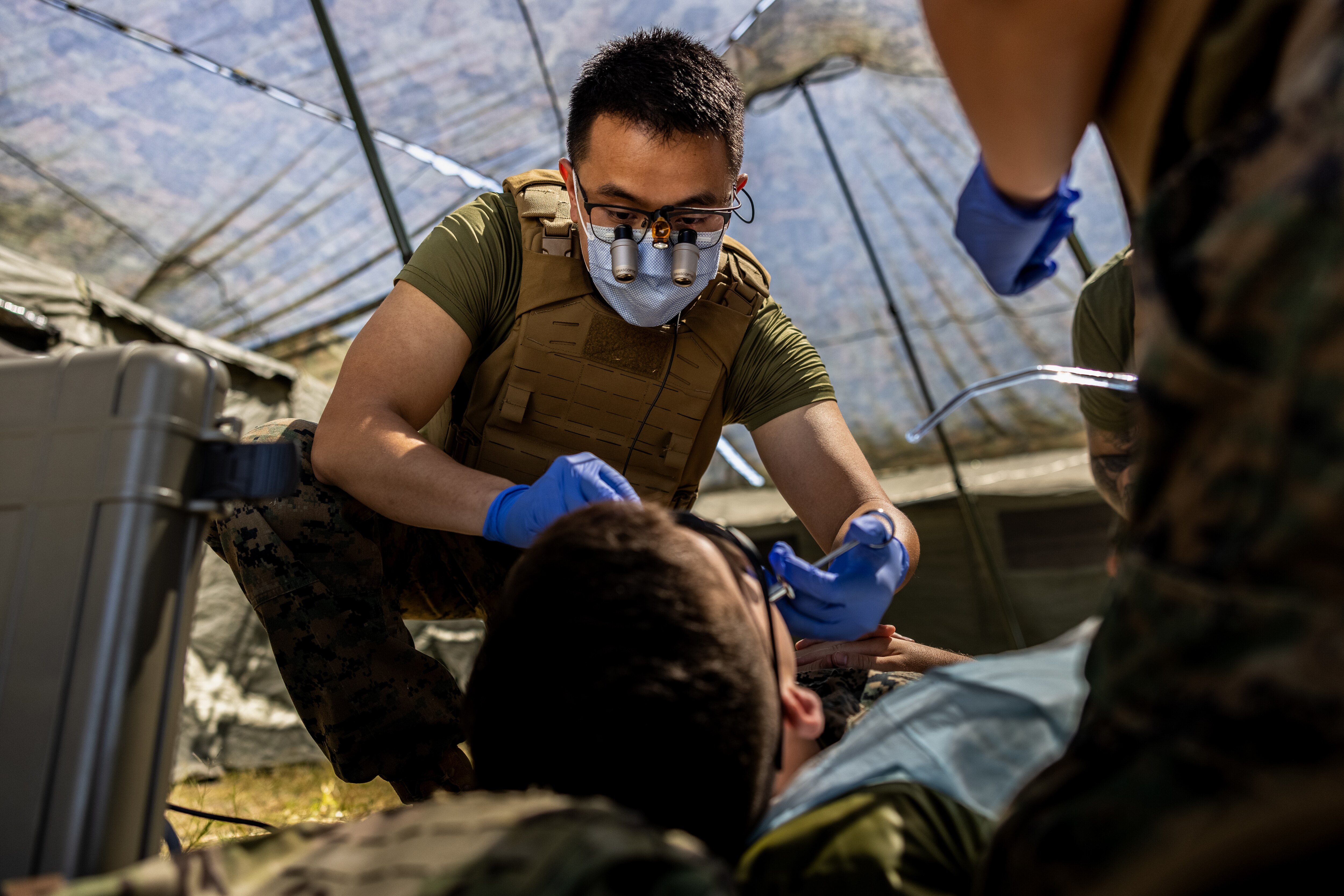 U.S. Navy Lt. Alex Pham, a dental officer with 1st Dental Battalion, 1st Marine Logistics Group, provides patient care during Authorized Dental Allowances List (ADAL) Exercise 25.1 on Marine Corps Base Camp Pendleton, California, Sept. 16, 2025. ADALEX is held semiannually to test and qualify corpsmen and dental assistants while building proficiency with expeditionary equipment and field operations in preparation for deployment. (U.S. Marine Corps photo by Lance Cpl. Mhecaela J. Watts)