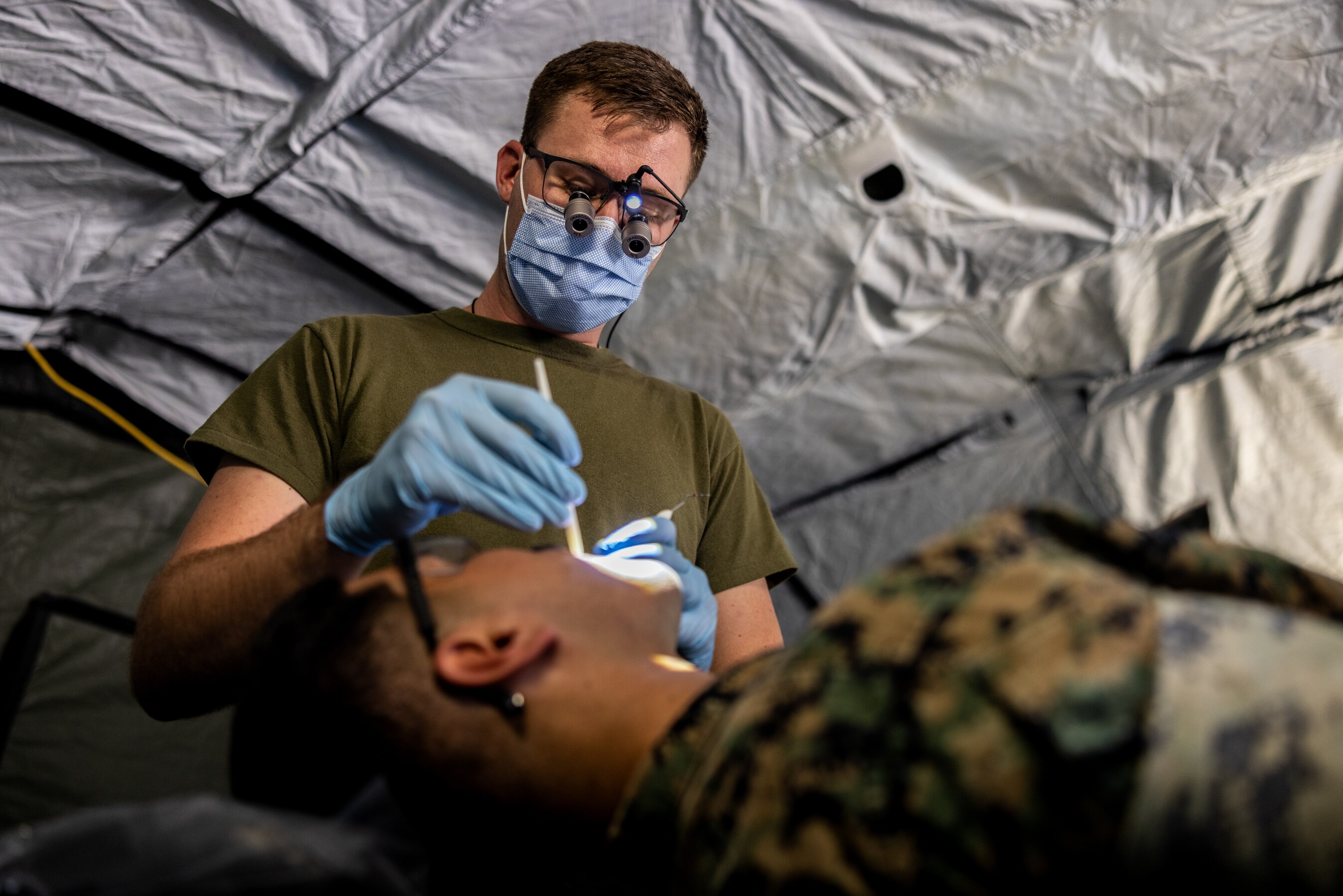 U.S. Navy Lt. Richard Fike, a dental officer with 1st Dental Battalion, 1st Marine Logistics Group, cleans a patient’s teeth during Authorized Dental Allowances List (ADAL) Exercise 25.1 on Marine Corps Base Camp Pendleton, California, Sept. 16, 2025. ADALEX is held semiannually to test and qualify corpsmen and dental assistants while building proficiency with expeditionary equipment and field operations in preparation for deployment. (U.S. Marine Corps photo by Lance Cpl. Mhecaela J. Watts)