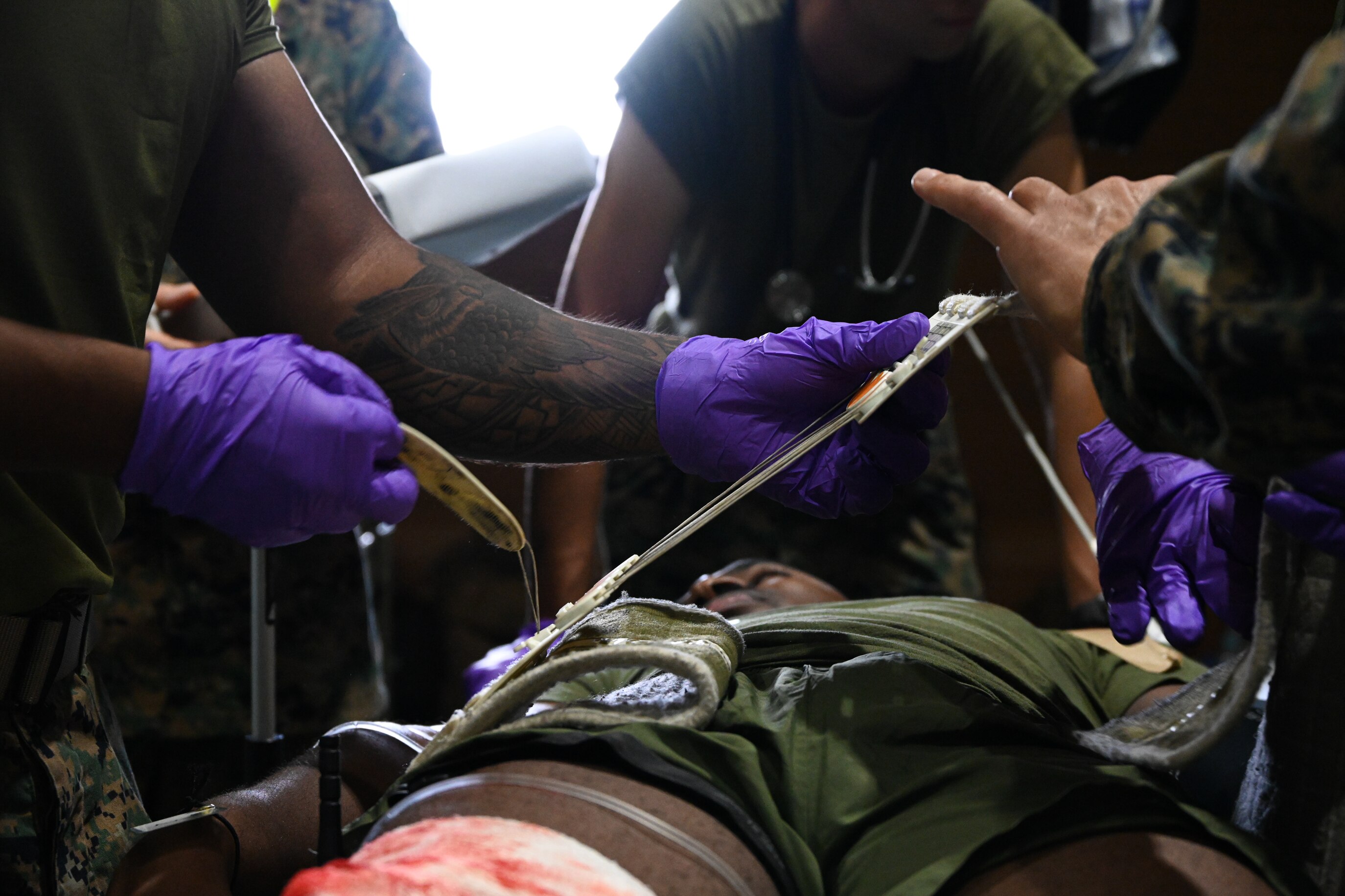 U.S. Sailors with 3rd Medical Battalion, 3rd Marine Logistics Group, apply a pelvic binder to a simulated casualty during bilateral mass casualty training as part of exercise Resolute Dragon 25 at Camp Naha, Okinawa, Japan, Sept. 19, 2025. Resolute Dragon is an annual bilateral exercise across Japan, including the Southwest Islands, that strengthens the command, control and multi-domain maneuver capabilities of III MEF and the Japan Ground Self-Defense Force’s Western Army personnel, alongside representatives across the U.S. and Japanese Joint Force, with a focus on controlling and defending key maritime terrain. (U.S. Marine Corps photo by Lance Cpl. Rachel Mason)