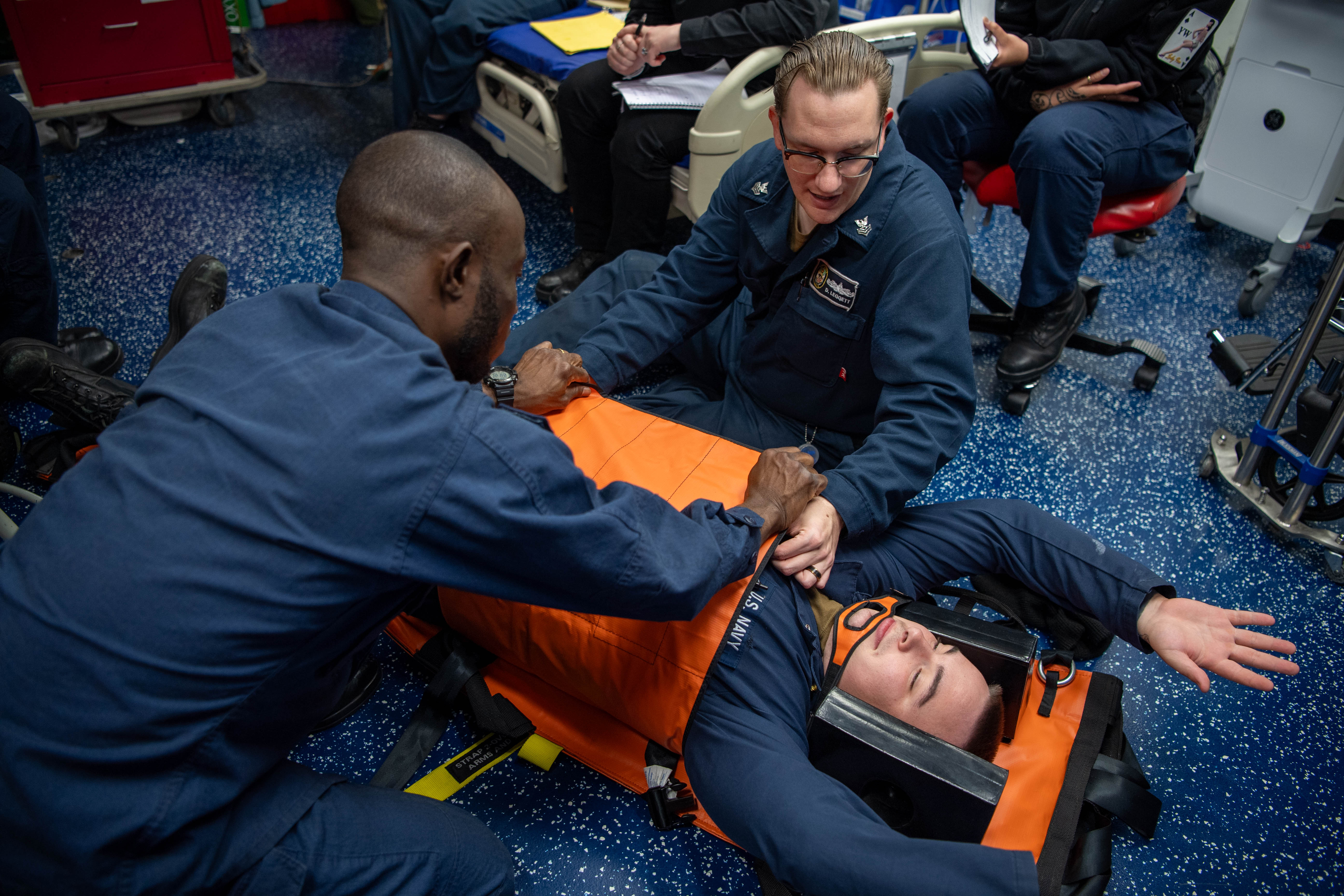 Hospital Corpsman 1st Class Dylan Legget, center, a native of Dallas, Georgia, and Logistics Specialist Seaman Ayobami Alayande, a native of Dallas, left, both assigned to the Wasp-class amphibious assault ship USS Boxer (LHD 4), secure a simulated patient into a stretcher during first-aid training, Sept. 15, 2025. Boxer is currently underway conducting routine operations in the U.S. 3rd Fleet. (U.S. Navy photo by Mass Communication Specialist Seaman Eliora Sims)