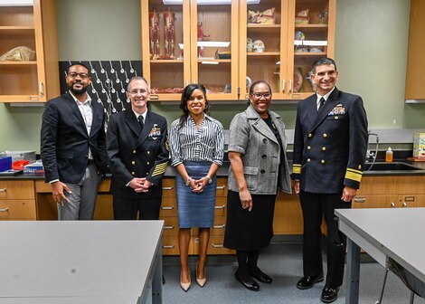 251013-N-IX644-1005 (Oct. 13, 2025) PHILADELPHIA, Pa. Rear Adm. Rick Freedman, right, Deputy Surgeon General of the Navy, and Senior Chief Hospital Corpsman Christopher Holzworth, second from left, both natives of Philadelphia, pose for a photo with Community College of Philadelphia leadership during a school visit that focused on collaboration in medicine and opportunities for Navy Medicine recruiting as part of the 250th birthday of the Navy and Marine Corps in Philadelphia, Oct. 13. For 250 years, Navy Medicine — represented by more than 44,000 highly-trained military and civilian healthcare professionals — has delivered quality healthcare and enduring expeditionary medical support to the warfighter on, below, and above the sea, and ashore. (U.S. Navy photo by Mass Communication Specialist 2nd Class Sasha Ambrose)