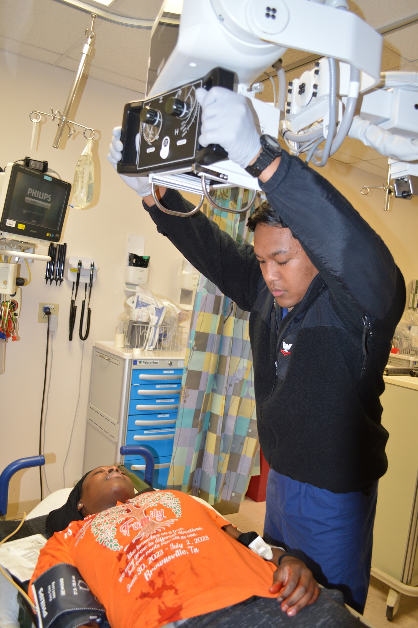 251017-N-ME175-1004 JACKSONVILLE, FL Hospital Corpsman 2nd Class Ethan Rim simulates an x-ray on a victim during a Code Grey Mass Casualty drill at Naval Hospital Jacksonville Oct. 17. The last similar drill the hospital held was in 2023. U.S. Navy Photo by Julie M. Lucas