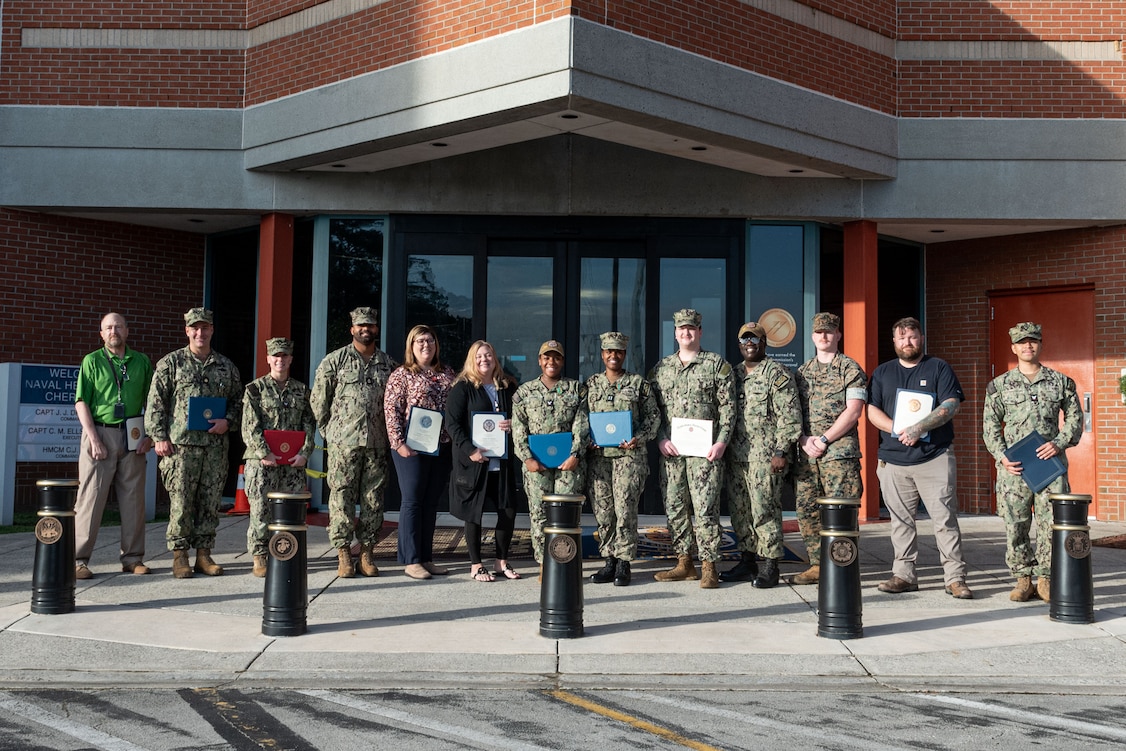 Staff serving aboard Naval Health Clinic Cherry Point gathered Friday, October 3 to celebrate the achievements and excellence of their peers at an awards ceremony. Lt. Cmdr. Jonathan Palmer was recognized with the Navy and Marine Corps Commendation Medal. Recognized with the Navy and Marine Corps Achievement Medal were Navy Lt. Kabresha Smith, Hospital Corpsman Second Class Jazmin Yaudes, Hospital Corpsman Third Class Asyia Gibbons. Civilians recognized for their years of service were Mr. Daniel Alber, 5 years, Mr. Nicholas Hoffman, 10 years, Ms. Dana Bayliss, 15 years and Ms. Tonya Andrew with 20 years.