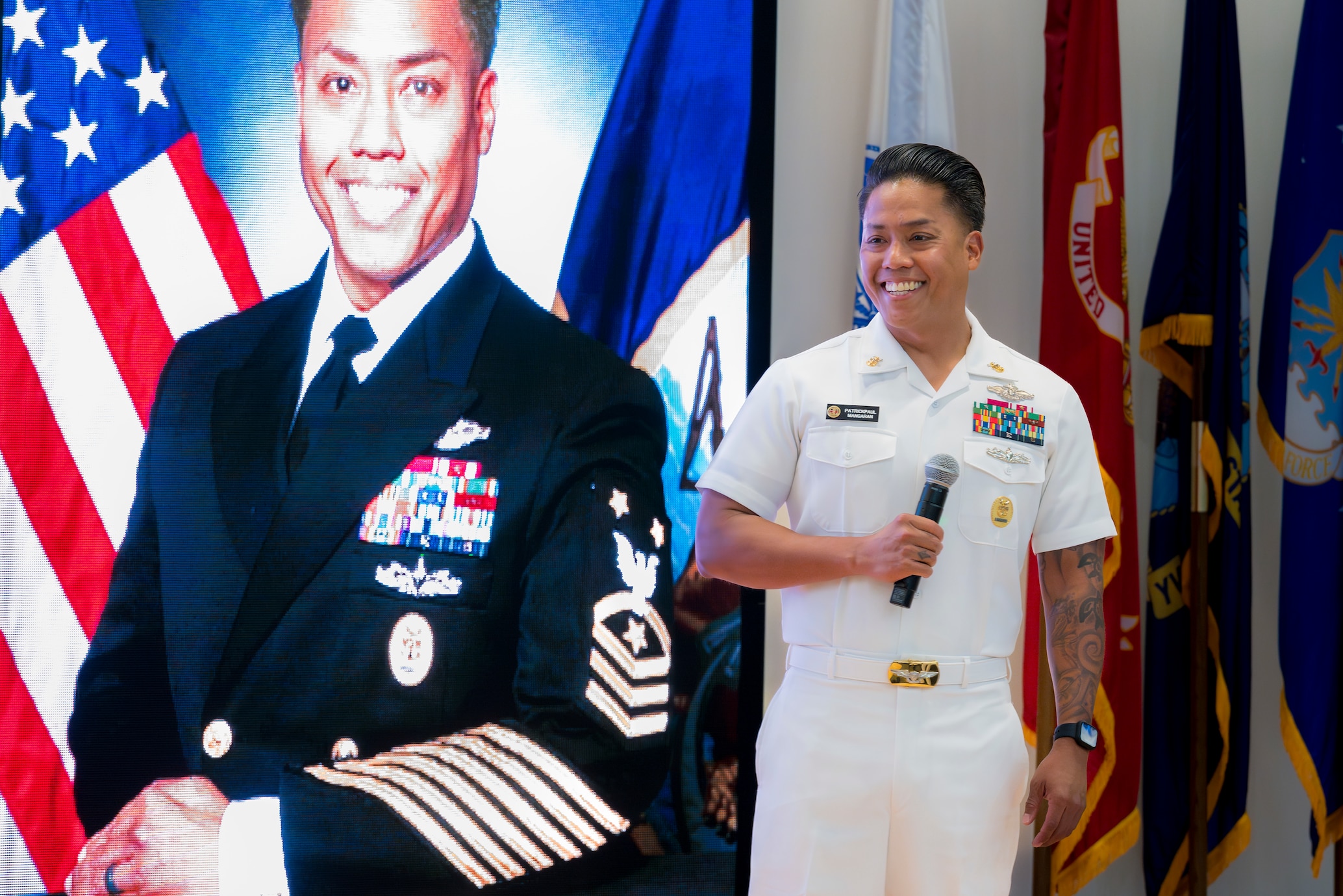 Force Master Chief PatrickPaul Mangaran, director of the Hospital Corps, addresses Hospital Corpsman Basic Course Class 190-25 students during their graduation at Joint Base San Antonio - Fort Sam Houston, Texas, Oct. 07, 2025. Mangaran's step son, Hospitalman Jaylen Rico was one of the graduates and joins his mother, father, stepfather and grandfather as a Hospital Corpsman. (U.S. Navy photo by Malcolm McClendon)