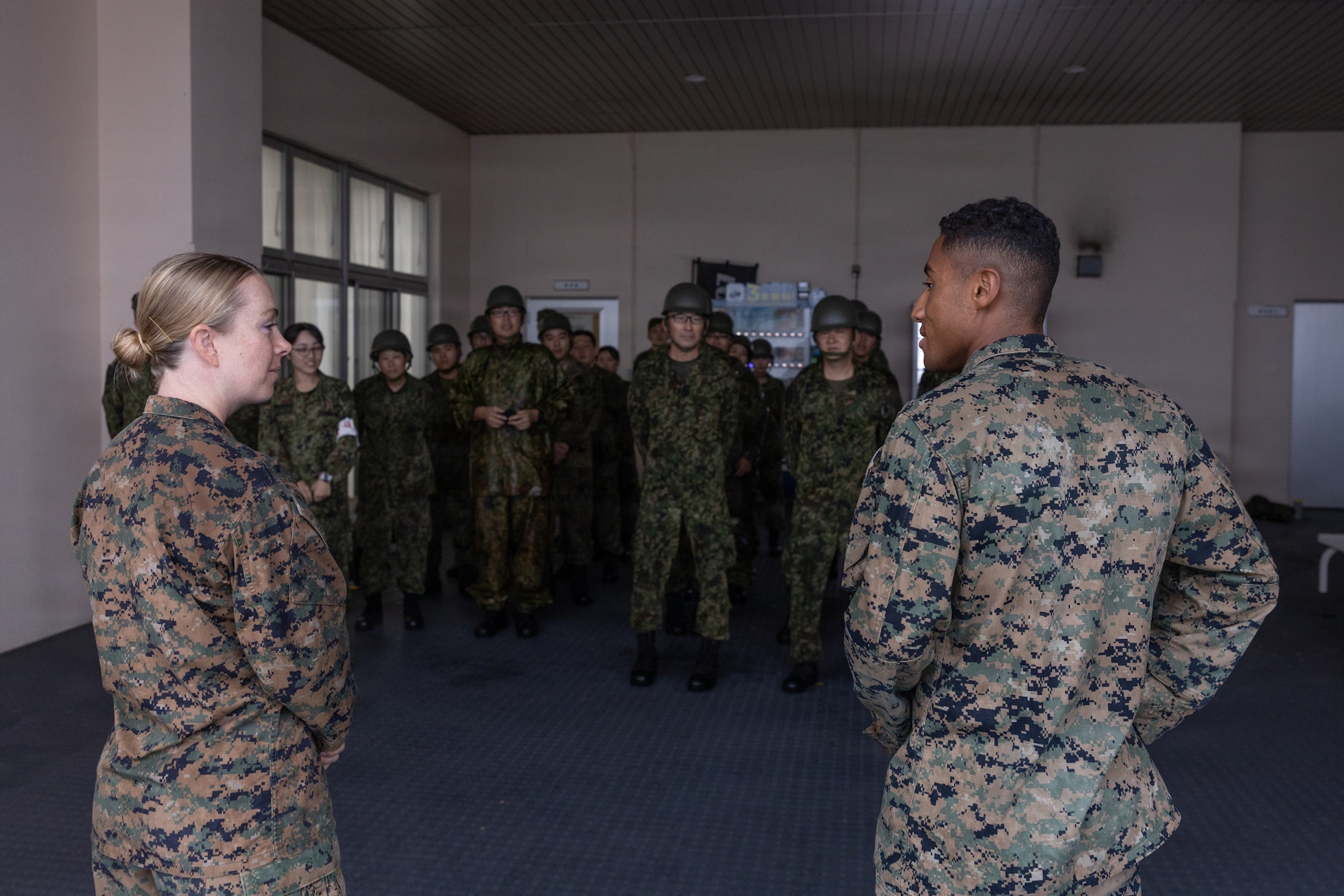 U.S. Navy Lt. Matti Hlatki, an emergency trauma nurse with 3rd Medical Battalion, 3rd Marine Logistics Group, speaks with Marine Corps 1st Lt. Taiyo Tatara, a communication strategy and operations officer with 3rd MLG, about exercise 07JX on Ishigaki, Okinawa, Japan, Oct. 25, 2025. 07JX is a bilateral exercise that aims to enhance bilateral Japan-U.S. capabilities for humanitarian assistance and disaster relief operations in the Southwest islands. (U.S. Marine Corps photo by Lance Cpl. Marcus Henson)