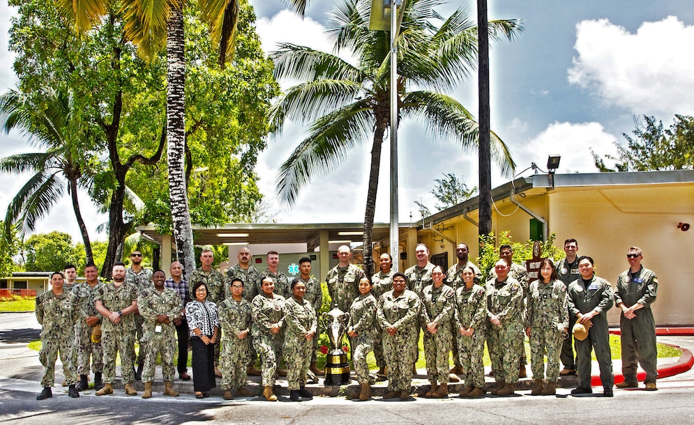 DIEGO GARCIA, British Indian Ocean Territory (Oct. 3, 2025) — Sailors and civilian staff assigned to U.S. Naval Hospital (USNH) Yokosuka’s Branch Health Clinic (BHC) Diego Garcia pose for a group photo. (U.S. Navy photo by USNMRTU Diego Garcia)