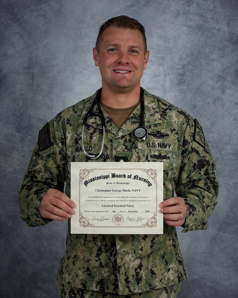 GULFPORT, Miss. (Dec. 5, 2025) Chief Hospital Corpsman Christopher Marlo, assigned to Naval Mobile Construction Battalion (NMCB) 11, stands for a portrait at Naval Construction Battalion Center Gulfport, Mississippi, Dec. 5, 2025 with his Licensed Practical Nurse certificate. Chief Marlo recently passed the NCLEX on his first attempt following new Mississippi legislation that allows Hospital Corpsmen to obtain Licensed Practical Nurse credentials. NMCB 11, assigned to Naval Construction Group TWO, is homeported in Gulfport, Miss. as part of the Naval Construction Force. (U.S. Navy photo by MC2 Alexa H. Trafton)