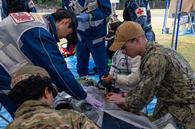 JOGASHIMA PARK, Japan (Nov. 9, 2025) — A U.S. Navy Hospital Corpsman assigned to U.S. Navy Medicine Readiness and Training Command Yokosuka works with Japanese responders to assess and treat a simulated casualty during Big Rescue Kanagawa 2025. The annual exercise is one of Kanagawa Prefecture’s largest disaster-response drills, involving U.S. Naval Hospital Yokosuka, Red Cross Yokosuka and Branch Health Clinic Atsugi personnel working alongside U.S. and Japanese agencies.(U.S. Navy photo by Daniel Taylor/USNMRTC Public Affairs)