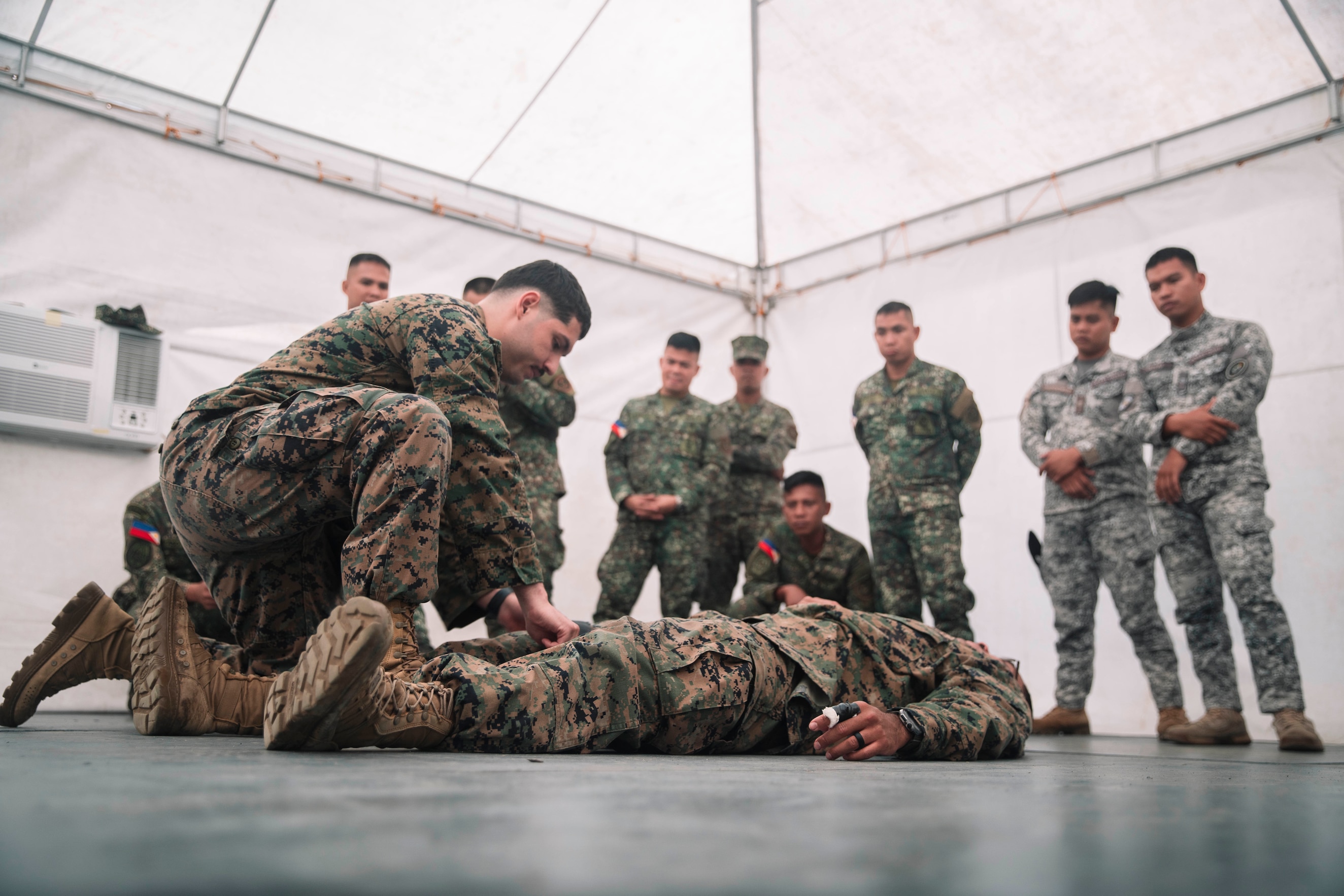 U.S. Navy Hospitalman Second Class Juan Florestorres, assigned to Marine Rotational Force-Southeast Asia, I Marine Expeditionary Force, explains how to provide medical care under fire to MRF-SEA Marines, Philippine Marines assigned to 3rd Marine Brigade and Philippine Coastguardsmen as part of a tactical combat casualty care subject matter expert exchange during exercise Marine Air Support Activity 2025 at Marine Base Camp Rodolfo, Palawan, Philippines, Oct. 13, 2025. TCCC is a training program for non-medical personnel to have knowledge and skills to render life-saving medical aid in the absence of medical personnel in combat scenarios. MASA 25 is an annual joint Philippine and U.S. military exercise focused on mutual defense, strengthening relationships, and rehearsing emerging aviation concepts. Florestorres is a native of Florida. (U.S. Marine Corps photo by Sgt. Luis Agostini)