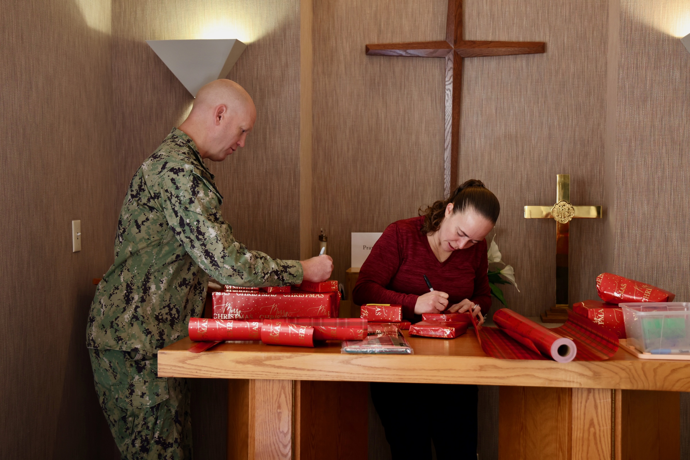 TWENTYNINE PALMS, Calif. (Dec. 17, 2025) — Navy Chaplain Lt. Cmdr. Nicholas Suddath (left) and Command Ombudsman Jennifer Belding (right) wrap holiday gifts during the Angel Tree program at Naval Hospital Twentynine Palms. The community-driven initiative anonymously connects volunteers with military children in need, helping make the holiday season brighter for Sailors and their families. (U.S. Navy photo by Christopher Jones/NMRTC Twentynine Palms Public Affairs Officer)