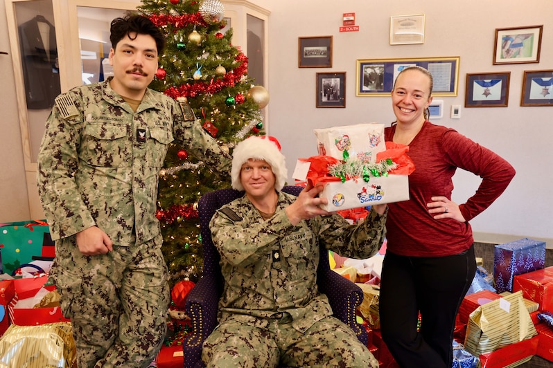 TWENTYNINE PALMS, Calif. (Dec. 17, 2025) — Navy Chaplain Lt. Cmdr. Nicholas Suddath (center), Religious Program Specialist 3rd Class Diego Escalante (left) and Command Ombudsman Jennifer Belding (right) pose in front of donated gifts during the Angel Tree program at Naval Hospital Twentynine Palms. The community-driven initiative provided more than 250 holiday gifts to 83 military children this year, anonymously connecting volunteers with Sailors’ families in need and helping make the holiday season brighter across the command. (U.S. Navy photo by Christopher Jones/NMRTC Twentynine Palms Public Affairs Officer)