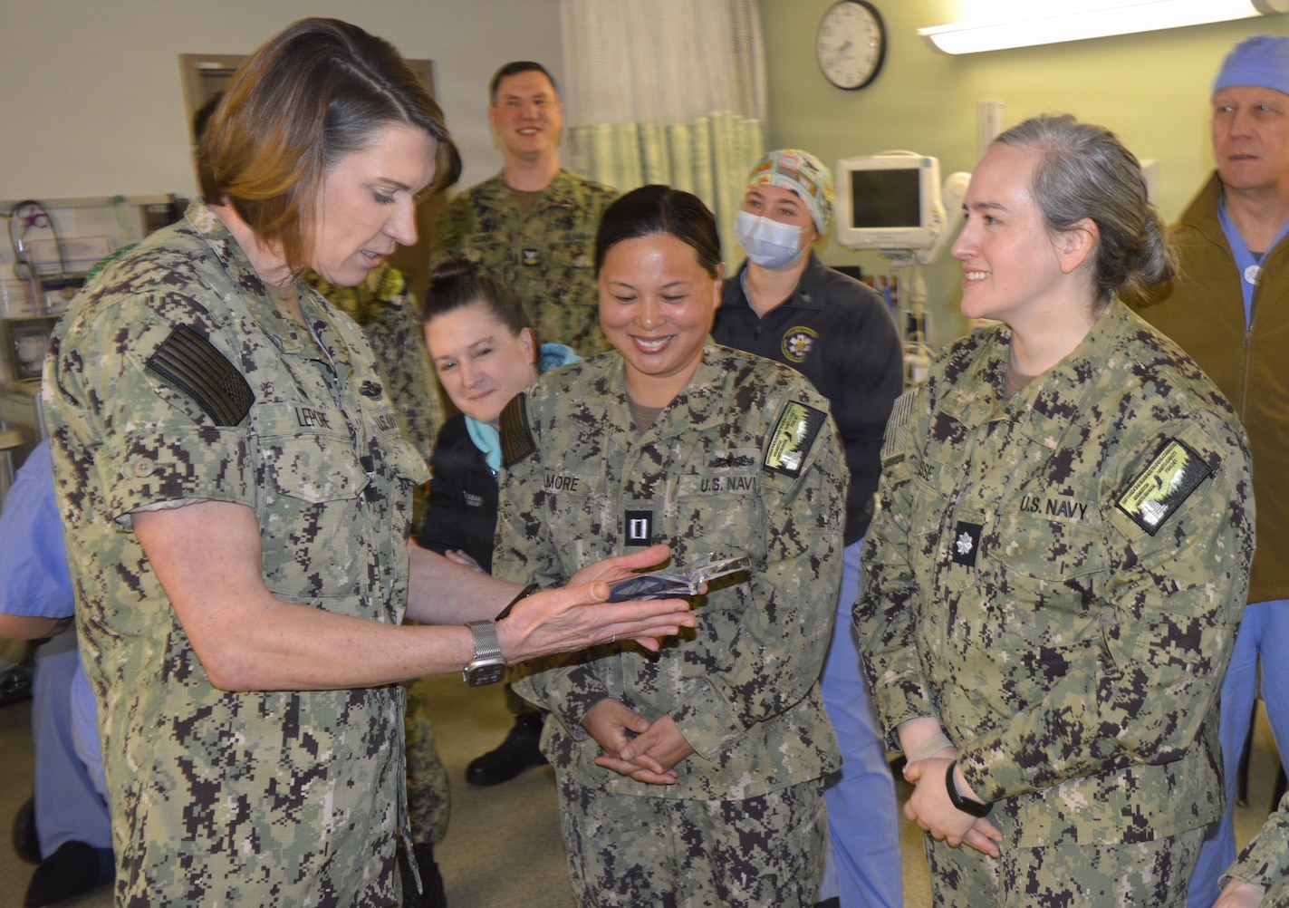 Extending a Bravo Zulu…Staff members assigned to Naval Hospital Bremerton Main Operating Room share their Go Clear Award with Capt. Karla Lepore, Naval Hospital Bremerton and Navy Medicine Readiness Training Command Bremerton commanding officer. The award was presented by the Association of perioperative Nurses to the Main OR team for their collective effort in for successfully eliminating surgical smoke in all operating rooms. The smoke reference is not associated with any tobacco or nicotine products but rather is specifically related to the elimination of surgical smoke, which can be produced during surgical cases from using energy-producing devices such as electrosurgery, lasers, and other powered instruments (Official Navy photo by Douglas H Stutz, NHB/NMRTC Bremerton public affairs officer).