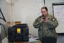 Information Systems Technician 2nd Class Raina Anderson, information systems technician assigned to Expeditionary Medical Facility (EMF) Kilo, Camp Lejeune, North Carolina, sends out a message to the EMF via the 1MC during training at Naval Expeditionary Medicine Warfighter Development Center, Camp Pendleton, California, Feb. 9–18, 2026. Communication ensures timely coordination and information flow across the EMF during simulated operations. (U.S. Navy photo by Petty Officer 2nd Class Leandra Mojica)