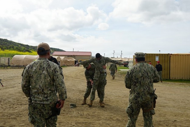 Expeditionary Medical Facility Kilo Sailors check a simulated patient for weapons during an EMF training at Naval Expeditionary Medicine Warfighter Development Center, Camp Pendleton, California, Feb. 9–18, 2026. The security screening procedure reinforces safety protocols for both patients and medical staff in casualty receiving areas. (U.S. Navy photo by Petty Officer 2nd Class Leandra Mojica)
