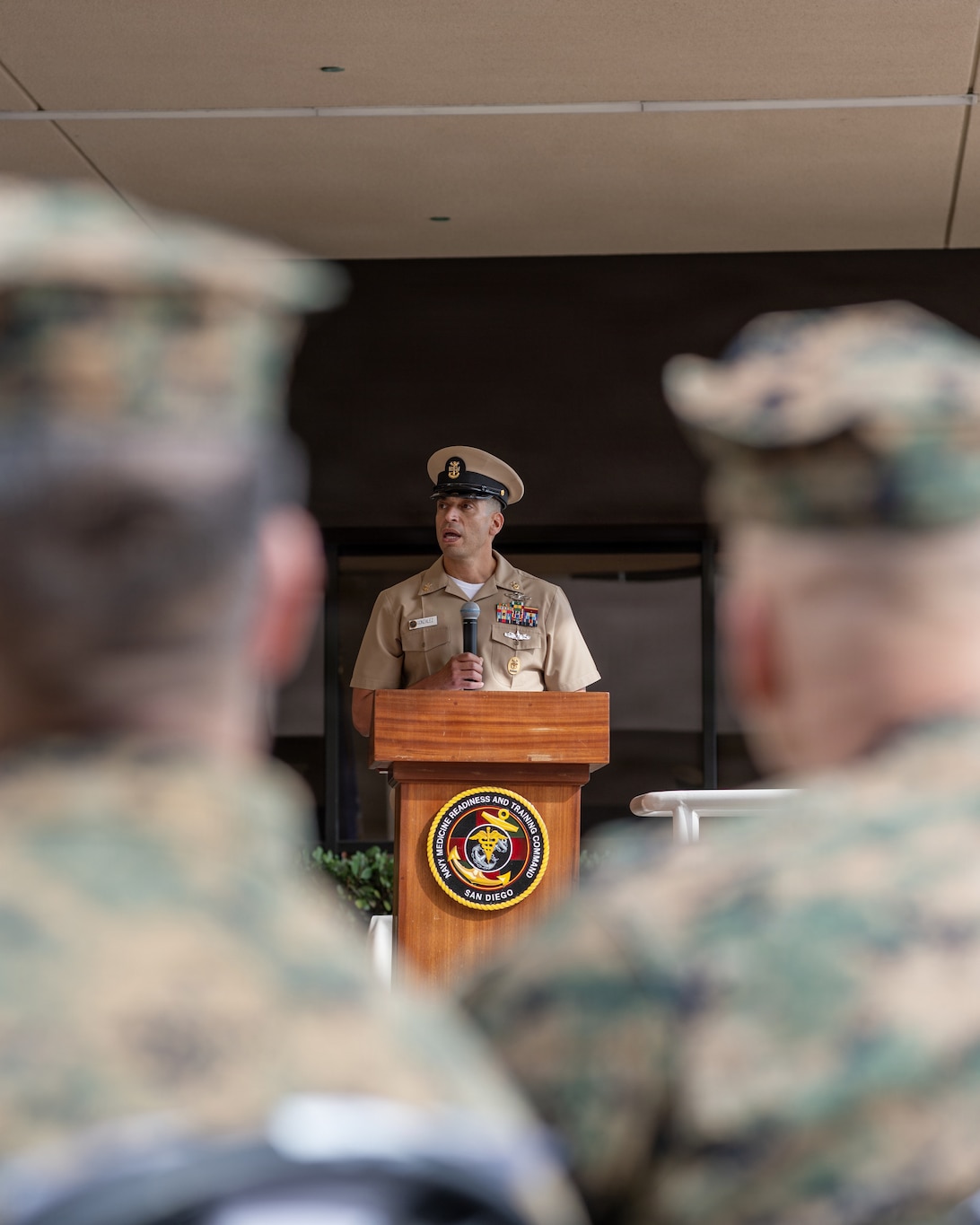 U.S. Navy Command Master Chief Petty Officer Adolfo Gonzalez, outgoing Navy Medicine Readiness and Training Command San Diego Command Master Chief, delivers remarks during a change of charge ceremony at Naval Medical Center San Diego, March 9. NMRTC San Diego supports Navy and Marine Corps readiness by ensuring its medical forces are ready to deploy and provide medical support, ashore or at sea. (U.S. Navy photo by Mass Communication Specialist Seaman Jason Afable)