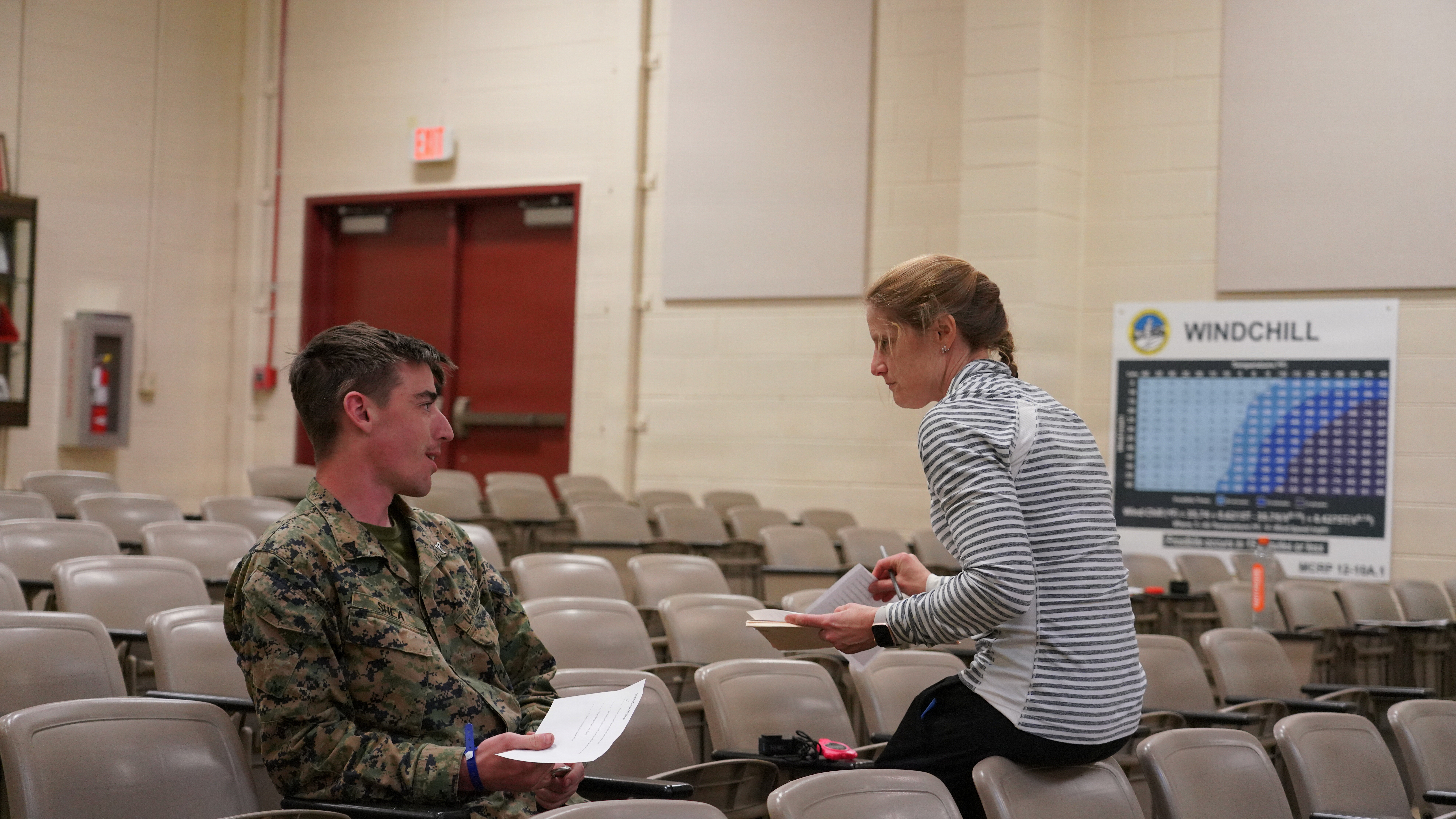 BRIDGEPORT, Calif. (Feb. 22, 2026) Rebecca McClintock, a research physiologist with Naval Health Research Center’s (NHRC) Environmental & Thermal Physiology team, meets with a military medical student in the Marine Corps Mountain Warfare Training Center lecture hall, to establish a baseline on his ability to recall a 9-line medical evacuation request and to record current levels of stress and anxiety prior to his cold-water immersion experience. These baseline results allow the researchers to build a clearer picture on the effects of the cold-water shock response on warfighters and analyze critical components that determine their ability to get back into the fight. Through its cold-water immersion studies, NHRC develops life-saving strategies that enable the warfighter to overcome the initial, lethal shock of entering frigid water. This vital research provides U.S. Naval, Marine Corps, and joint forces with the tools to maintain cognitive function and enhance survivability in the most extreme maritime environments. (U.S. Navy photo by Matthew Reyes/released)
