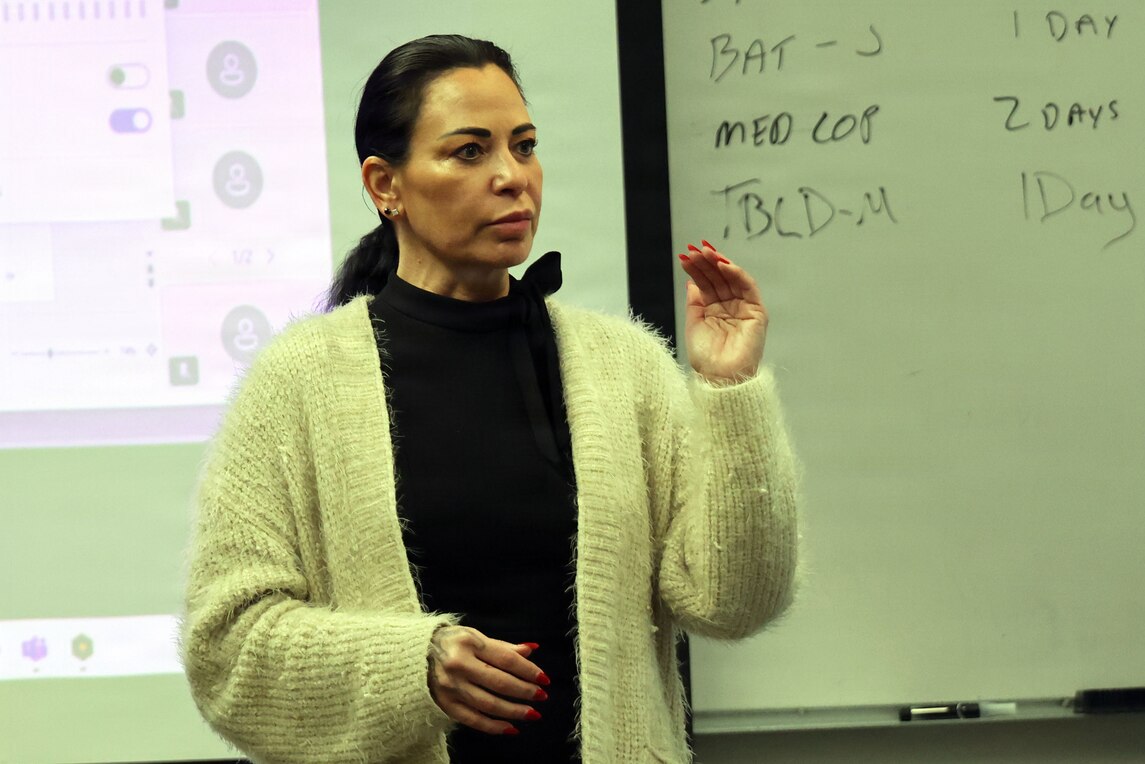 Nikki Stevenson, the Joint Operational Medicine Information Systems government training lead, explains to subject matter experts their critical role in finalizing the Naval Training Systems Plan at the Surface Warfare Medical Institute in San Diego, Feb. 24, 2026. The NTSP is a comprehensive training plan for the Navy's next-generation operational medical technology, which will modernize electronic health records for the fleet.