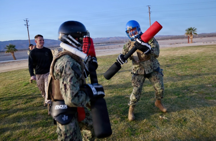 Staff Sgt. Joshua Hutchinson (left) referees a pugil sticks match between Master-at-Arms 3rd Class Thuan Nguyen (center) and Hospital Corpsman 2nd Class Arturo Fregoso during a Marine Corps Martial Arts Program Tan Belt course at Marine Corps Air Ground Combat Center Twentynine Palms on Dec. 15, 2025. The training bolsters interoperability with Marines to provide war-ready medical care, increases lethality and reinforces the warrior ethos. (U.S. Navy photo by Christopher Jones, Navy Medicine Readiness and Training Command Twentynine Palms / Naval Hospital Twentynine Palms public affairs officer).