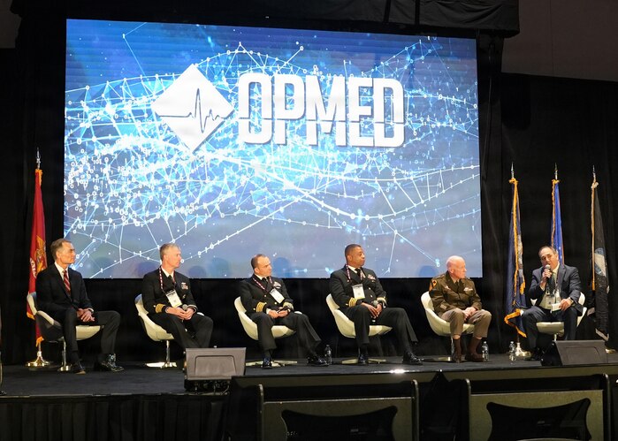 SAN ANTONIO – (March 17, 2026) – Dr. Darrin Frye (right), chief science director, Naval Medical Research Unit (NAMRU) San Antonio, served as a panelist on a continuing education panel titled, “Overcoming the Unique Medical Challenges across the Indo-Pacific Theater during the 2026 Annual Operational Medicine Symposium (OpMed) & Technology Showcase held at the Henry B. Gonzales Convention Center. Other panelists included Capt. Niels Olson, Medical Corps, chief medical officer, Human Systems Portfolio, Defense Innovation Unit; Capt. Delbert Clark, Medical Corps, command surgeon, 3rd Marine Division; Capt. Richard Gilliard Jr., Medical Service Corps, commanding officer, U.S. Naval Hospital Okinawa, Japan; and U.S. Army Maj. Gen. Darrin Cox, commanding general, 18th Theater Medical Command. Dr. Michael McGinnis, executive director of the U.S. Navy Bureau of Medicine and Surgery, and director of the Navy Medicine Civilian Corps served as the panel’s moderator. OpMed is one of the largest and most influential military medical events in North America for senior medical officials, clinicians, government leaders, and solution providers. The symposium explores how the Military Health System is preparing for large scale combat operations by championing innovations in combat casualty care to strengthen warfighter survivability and enhance the medical readiness of the joint force. NAMRU San Antonio, part of Navy Medicine Research & Development, works alongside research partners in the civilian sphere, academia, industry, and other government agencies to drive support of Department of War objectives for a lethal fighting force and ensure U.S. service members have access to the latest scientific advances. (U.S. Navy photo by Burrell Parmer, NAMRU San Antonio Public Affairs/Released)