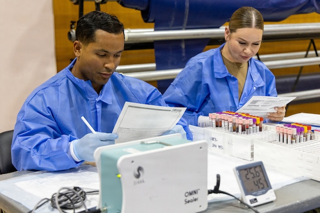 YOKOSUKA, Japan (Feb. 25, 2026) — Laboratory personnel from the Armed Services Blood Bank Center (ASBBC) Okinawa coordinate blood processing operations during a blood drive at Yokosuka’s Fleet Recreation Gym. U.S. Naval Hospital (USNH) Yokosuka, in partnership with ASBBC Okinawa, hosted a two-day blood drive at Commander, Fleet Activities Yokosuka’s Fleet Recreation Gym, Feb. 25–26, collecting 179 units of whole blood in support of operational readiness across the Indo-Pacific region. (U.S. Navy photo by Daniel Taylor/USNMRTC Yokosuka Public Affairs)