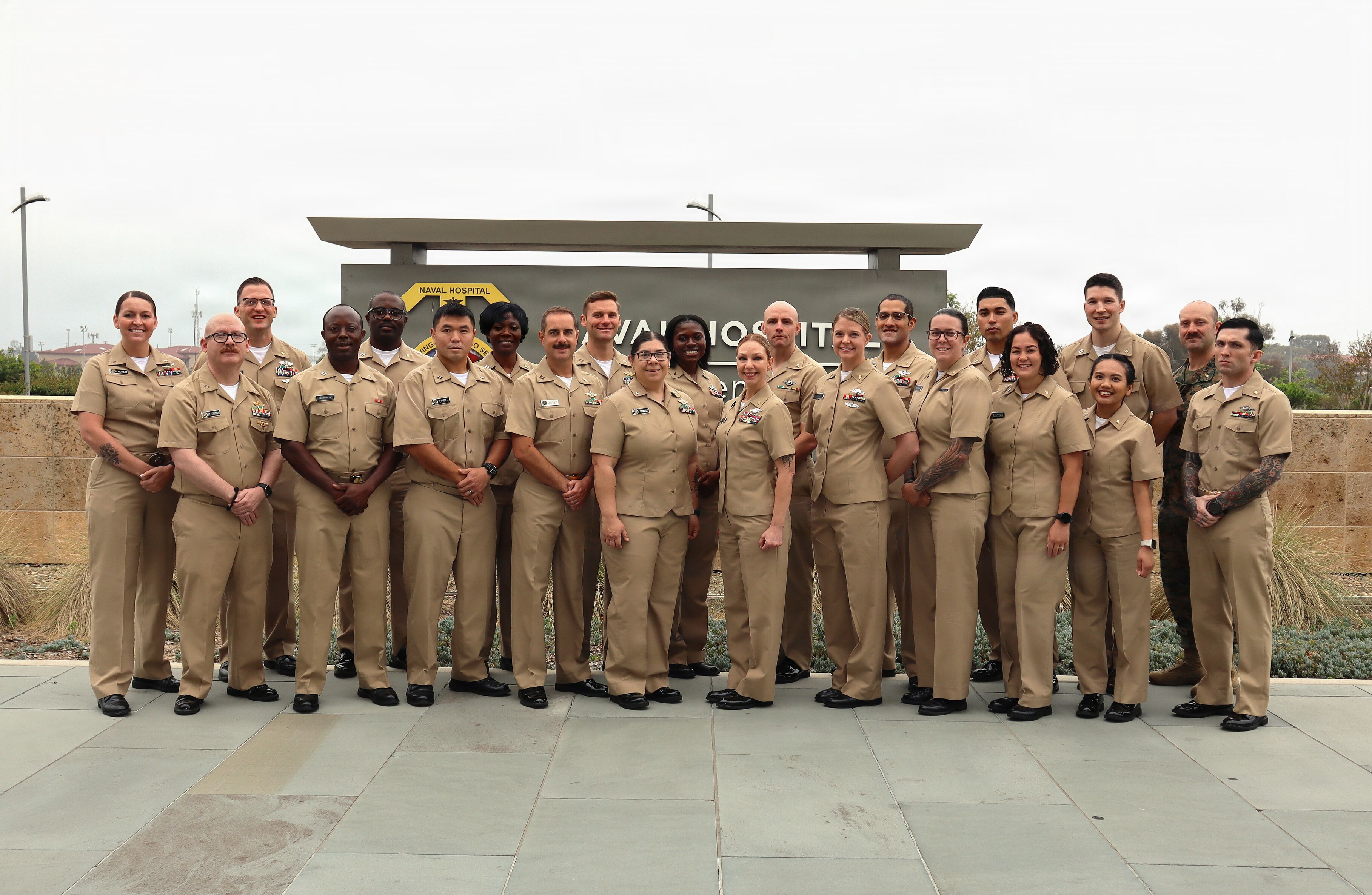 Graduates from the Division Officer Leadership Course hosted by Navy Medicine Readiness and Training Command Camp Pendleton pose with the course leaders, Cmdr. Catalina Coronado, the previous department head for NMRTC Camp Pendleton staff education and training, and Lt. Cmdr. Roberta Orozco, the current department head for NMRTC Camp Pendleton staff education and training, outside the west entrance to Naval Hospital Camp Pendleton on March 27, 2026. According to the Navy Medicine website, “DIVOLC is a service school requirement for O-1 through O-3 medical department officers who graduated from Officer Development School after January 2018.”