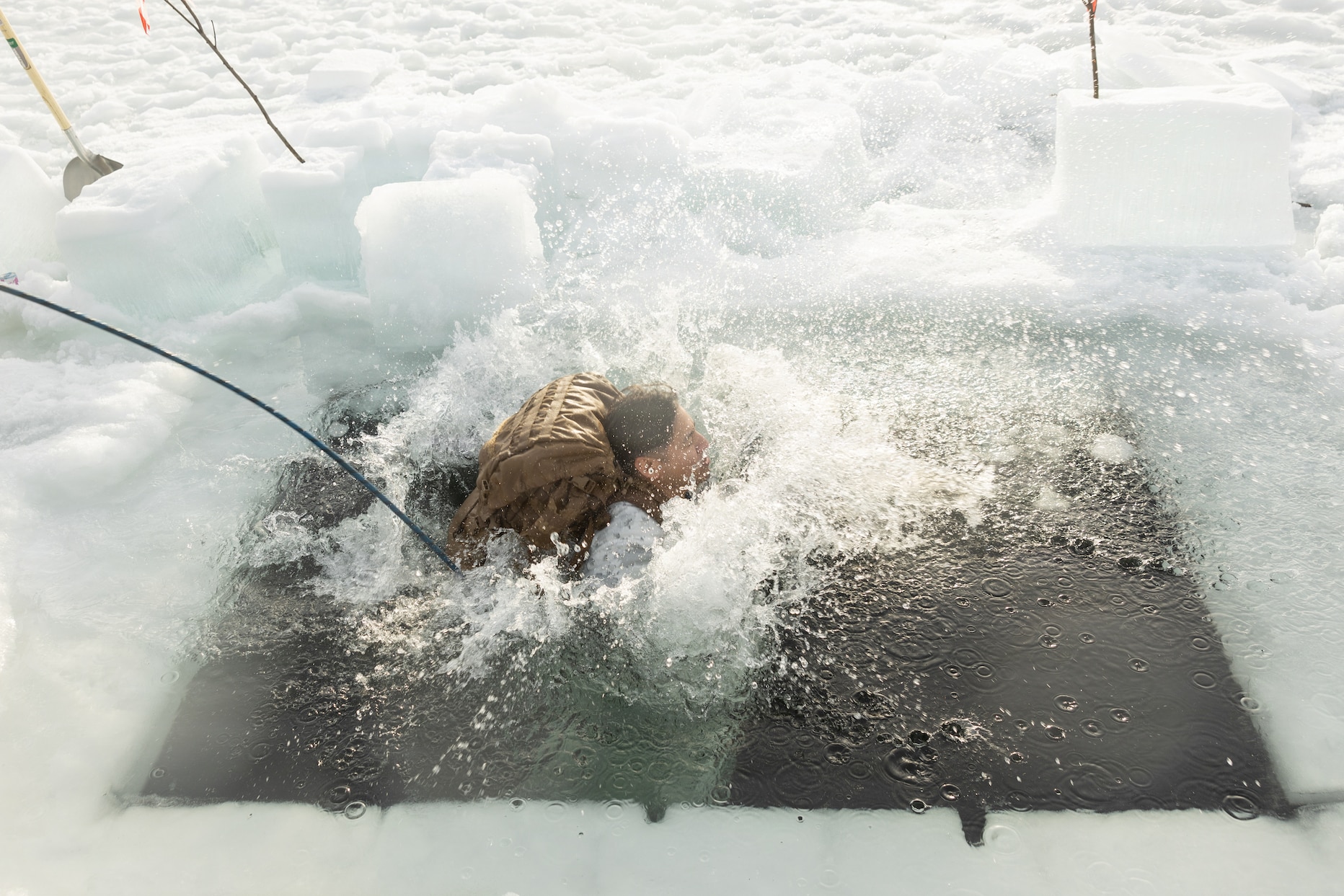 U.S. Navy Hospital Corpsman 1st Class Luis Esquivel, with 2nd Distribution Support Battalion, Combat Logistics Regiment 27, 2nd Marine Logistics Group, participates in a cold plunge near Elvegardsmoen, Norway, March 10, 2026. The training taught Marines and Sailors how to manage the effects of cold-water submersion and perform active rewarming procedures during exercise Cold Response 26. A key component of NATO's enhanced vigilance activity Arctic Sentry, exercise Cold Response 26 is a Norwegian-led winter military exercise designed to enhance collective defense capabilities and ensure U.S. readiness to rapidly deploy and seamlessly operate alongside NATO Allies in challenging arctic conditions. Esquivel is a native of Texas. (U.S. Marine Corps photo by Lance Cpl. Franco Lewis)