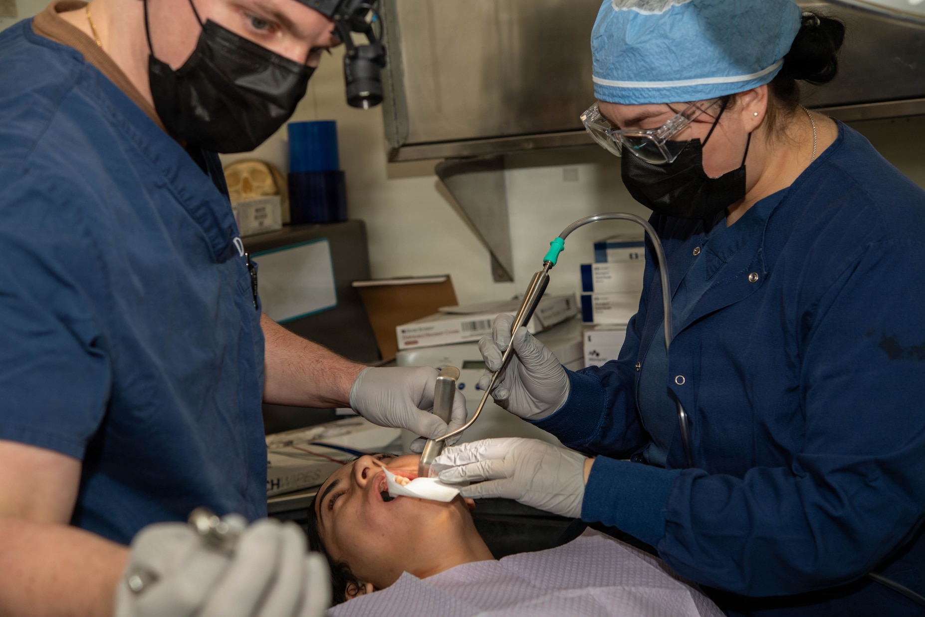 U.S. Navy Lt. Shane Burns, left, and Hospital Corpsman 3rd Class Jaina Shappee perform a wisdom tooth removal on a patient aboard Nimitz-class aircraft carrier USS Dwight D. Eisenhower (CVN 69), Feb. 25, 2026. Eisenhower is moored at Norfolk Naval Shipyard for a Planned Incremental Availability maintenance period. (U.S. Navy photo by Mass Communication Specialist Seaman Melina Rossi)