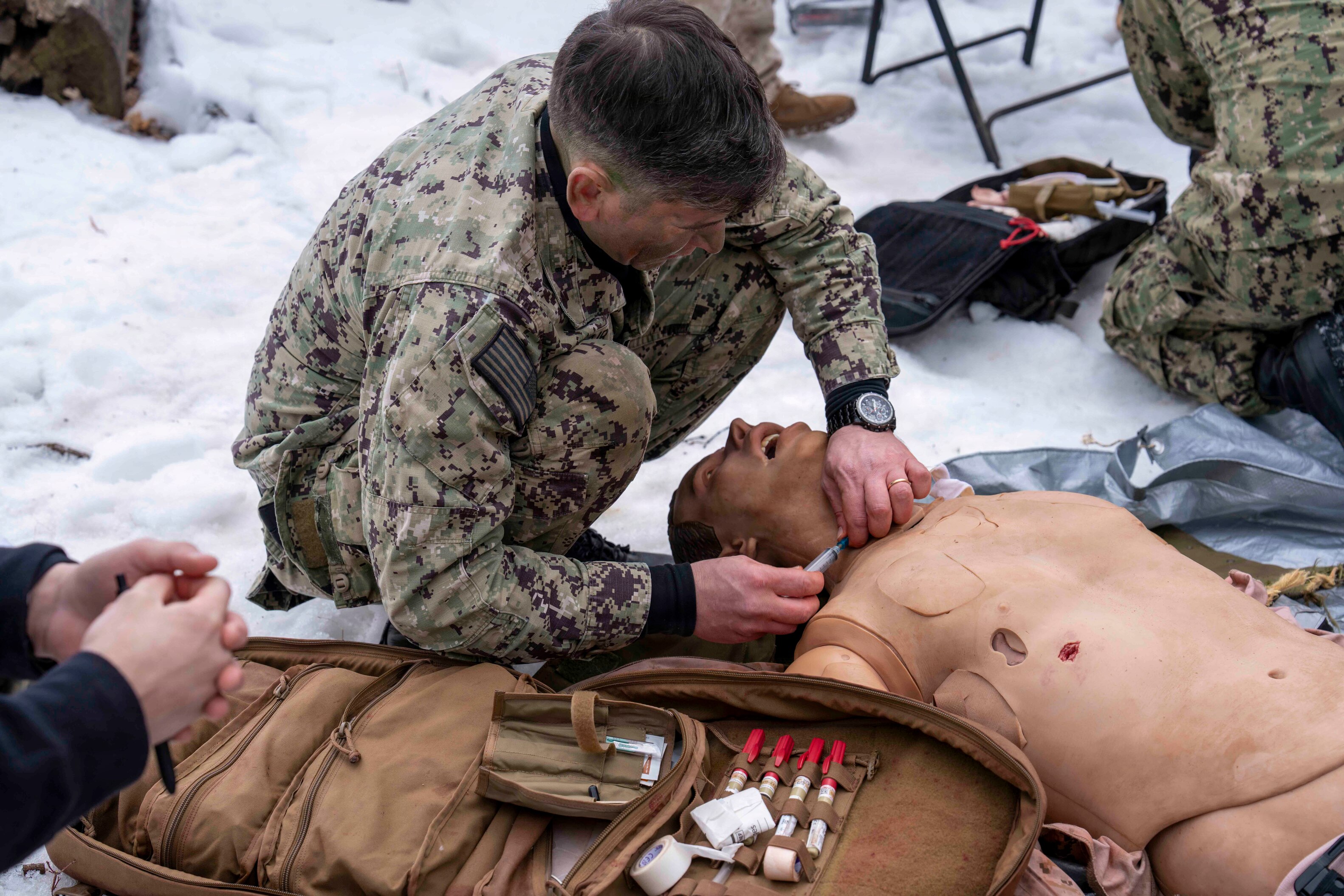 260212-N-JC800-1010 BETHESDA, Md. (Feb. 12, 2026) - Hospital Corpsman 2nd Class Richard Blair, assigned to the Na val Postgraduate Dental School at Naval Medical Leader and Professional Development Commmand, simulates administering a shot during a final exercise as part of the Tactical Combat Casualty Course. (U.S. Navy Photo by Mass Communication Specialist 1st Class Heath Zeigler/Released)