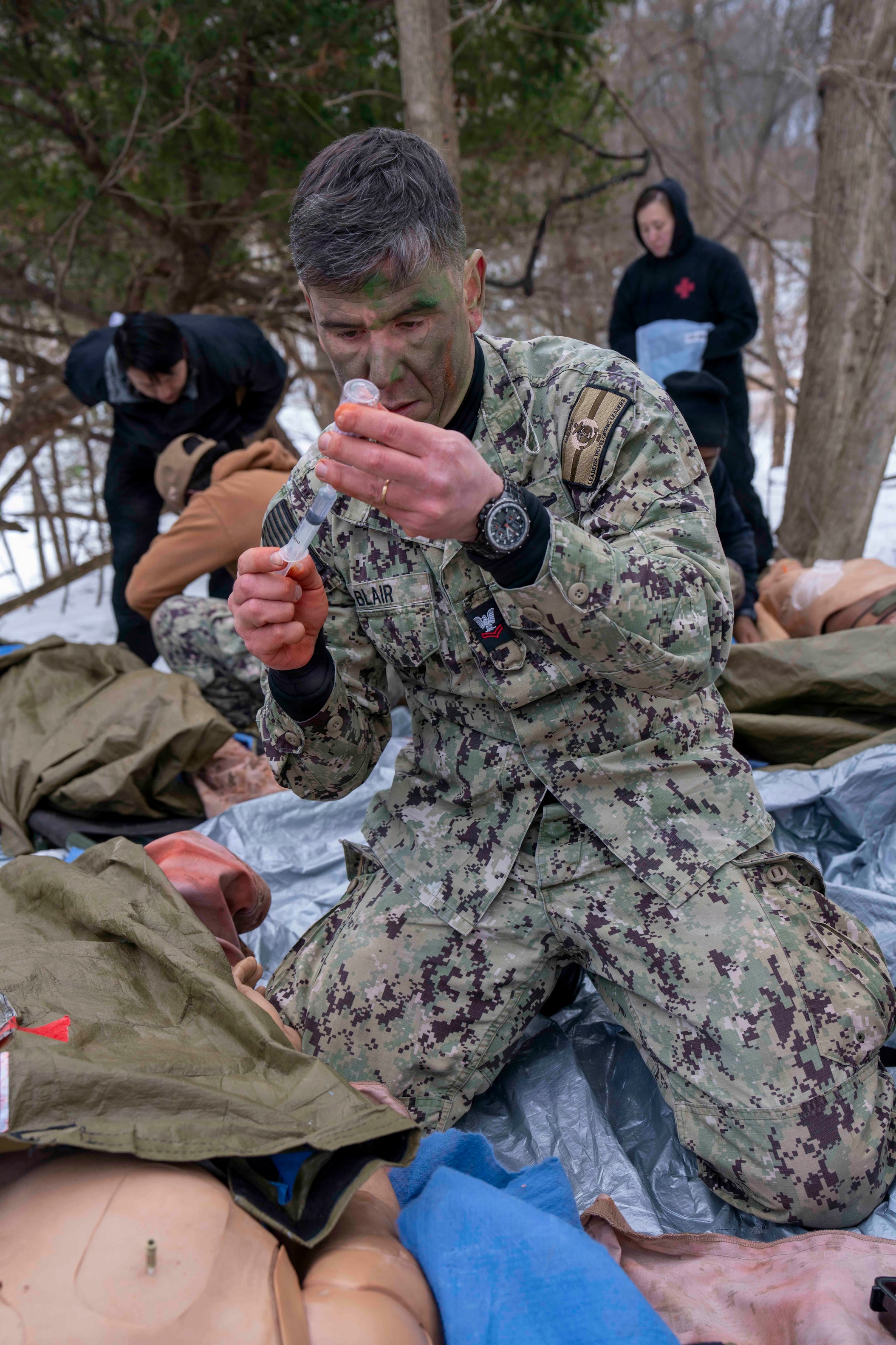 260212-N-JC800-1013 BETHESDA, Md. (Feb. 12, 2026) - Hospital Corpsman 2nd Class Richard Blair, assigned to the Na val Postgraduate Dental School at Naval Medical Leader and Professional Development Commmand, simulates readying a shot during a final exercise as part of the Tactical Combat Casualty Course. (U.S. Navy Photo by Mass Communication Specialist 1st Class Heath Zeigler/Released)
